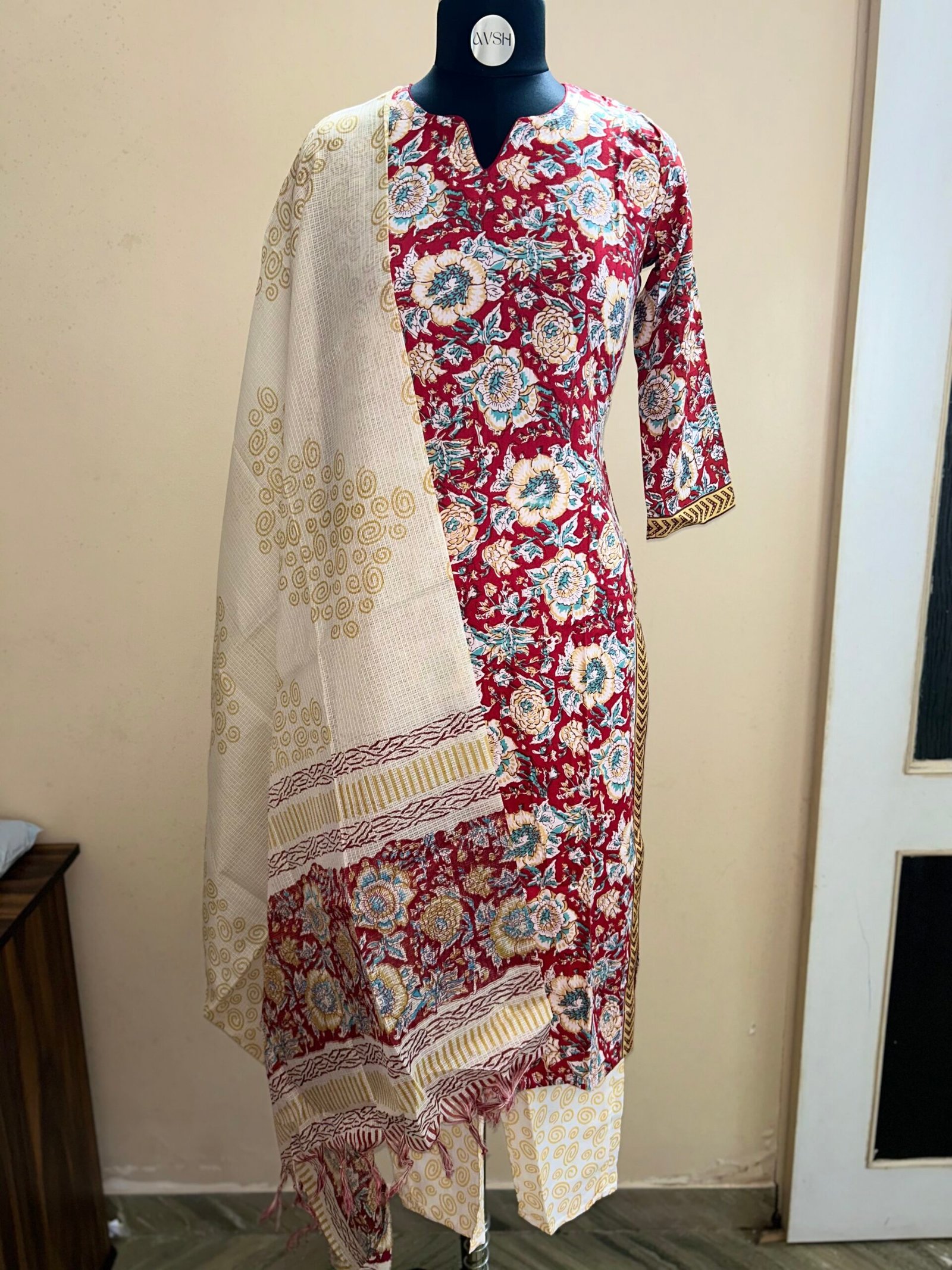Top length: 44 inches, Sleeves: 16 inches Pant: Straight cut pant with one pocket. Have elastics, Length: 36 inches, Shawl: Elegant kota shawl. |